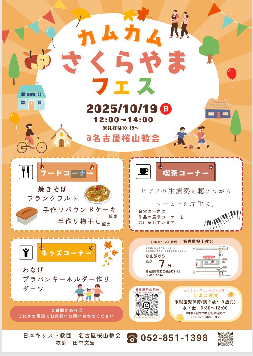 日本キリスト教団 名古屋桜山教会 牧師 田中文宏 〒466-0044 名古屋市昭和区桜山町1−12 TEL 052-851-1398 FAX 052-870-5266